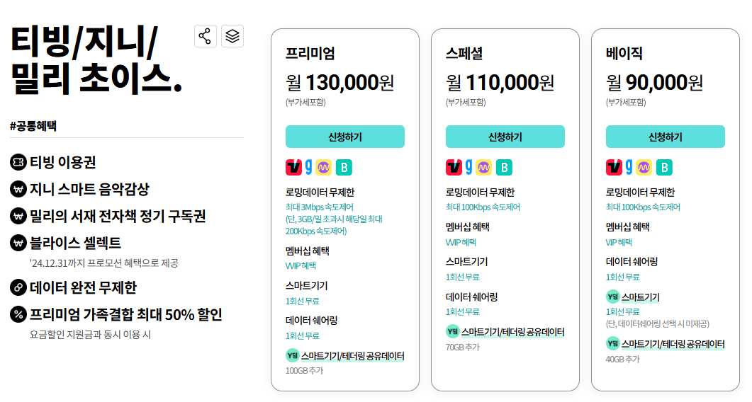 - 요금제에 따라 제공되는 티빙 이용권이 다를 수 있으므로, 가입 전에 확인이 필요합니다.